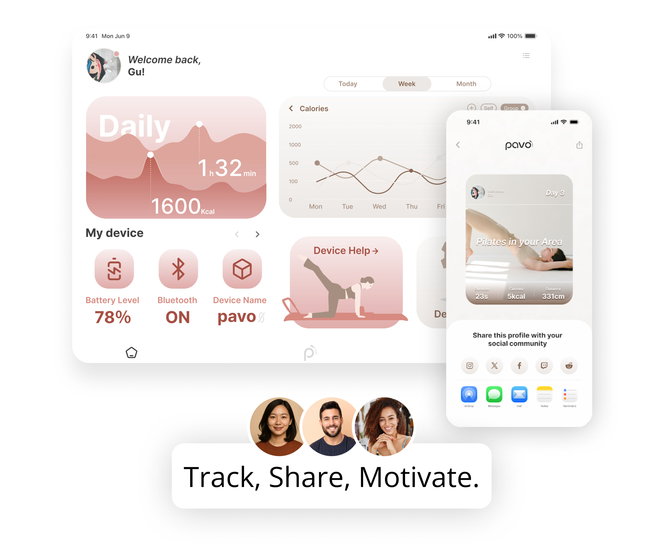 Pavo keeps you connected to your progress with real-time feedback. Workout time, calories burned, and spring resistance are displayed instantly on both the device screen and the Pavo app. Motion sensors detect every movement and resistance change, so your session metrics are always accurate, immediate, and tailored to your profile.
