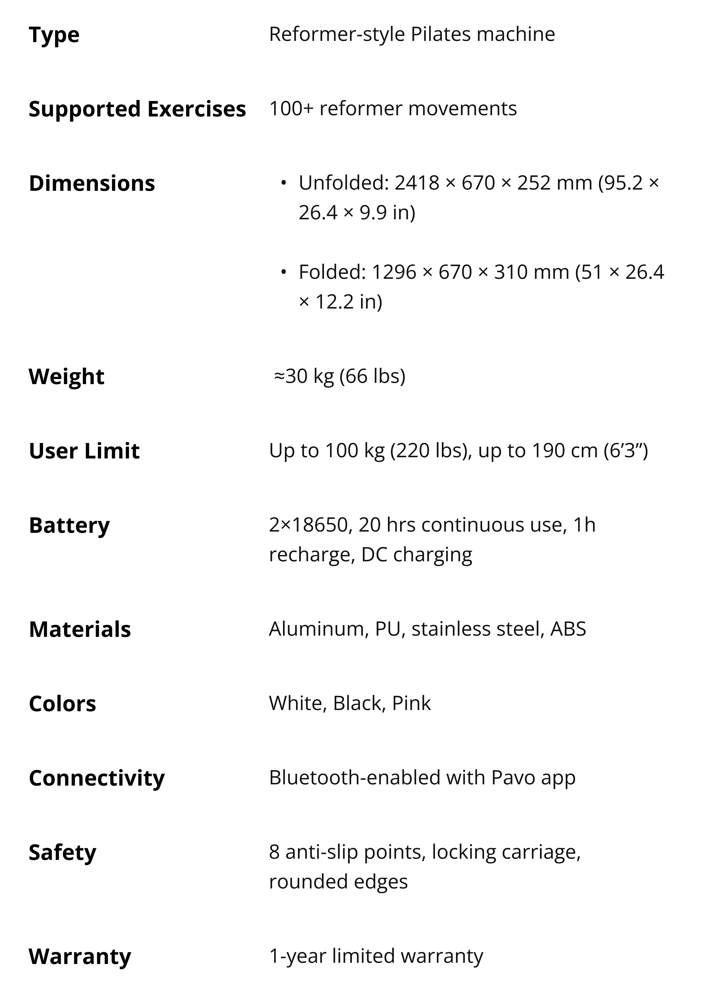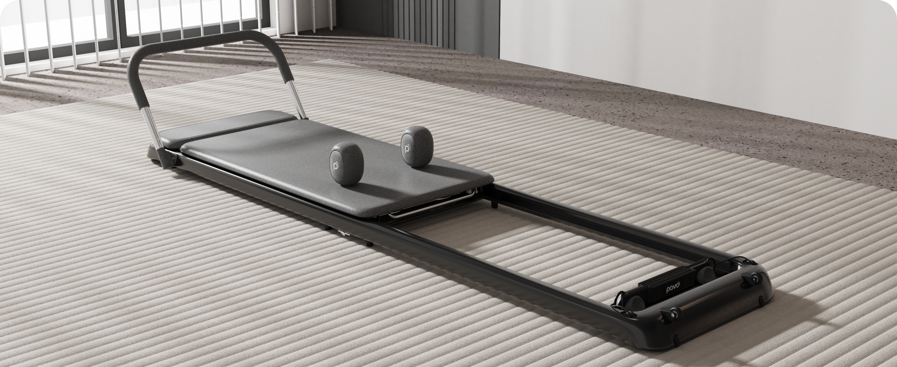 Meet Pavo: An intelligent, space-saving Pilates reformer that brings studio training into your home. With smart tracking, guided classes, and modern elegance, it is designed to make Pilates accessible for everyone.